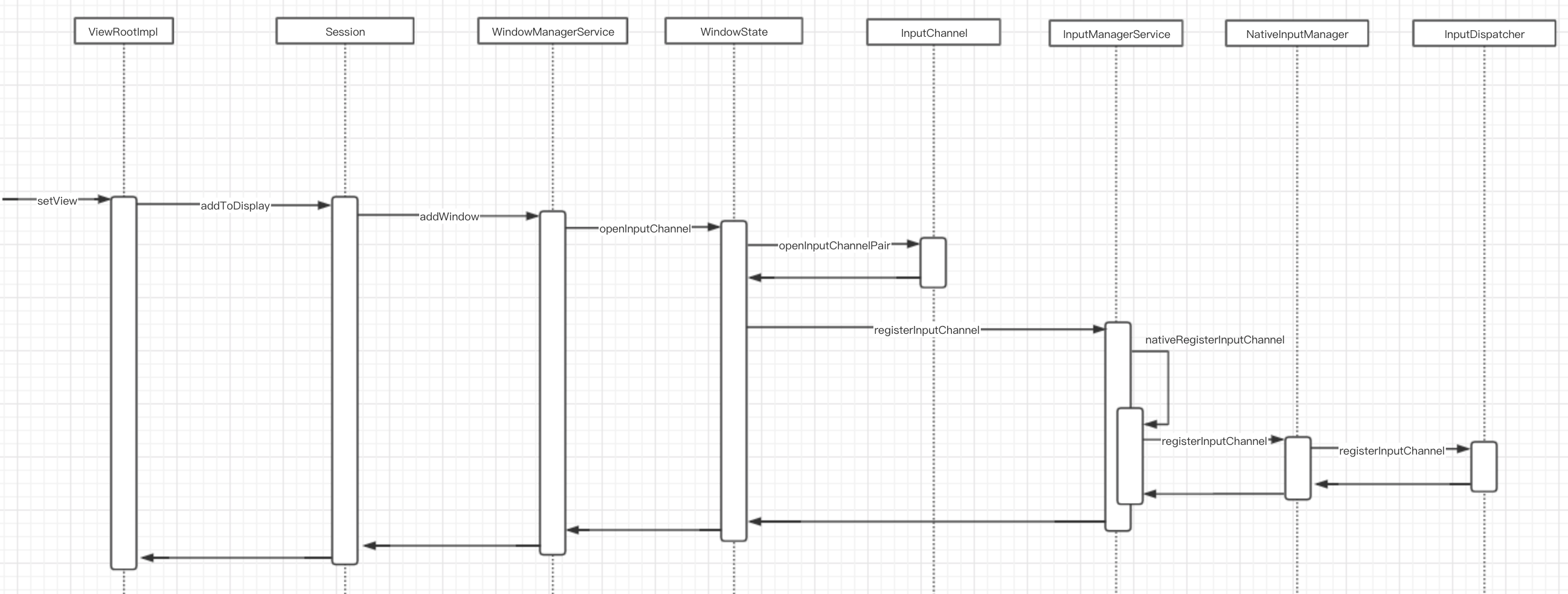 在应用层新的顶层窗口需要被注册到WMS中是在ViewRootImpl.setView实现的,我们从这里开始一路往下追,可以看到最后会调用到InputDispatcher::registerInputChannel注册通信的channel__放到InputDispatcher::mConnectionsByFd__这个KeyedVector里面: