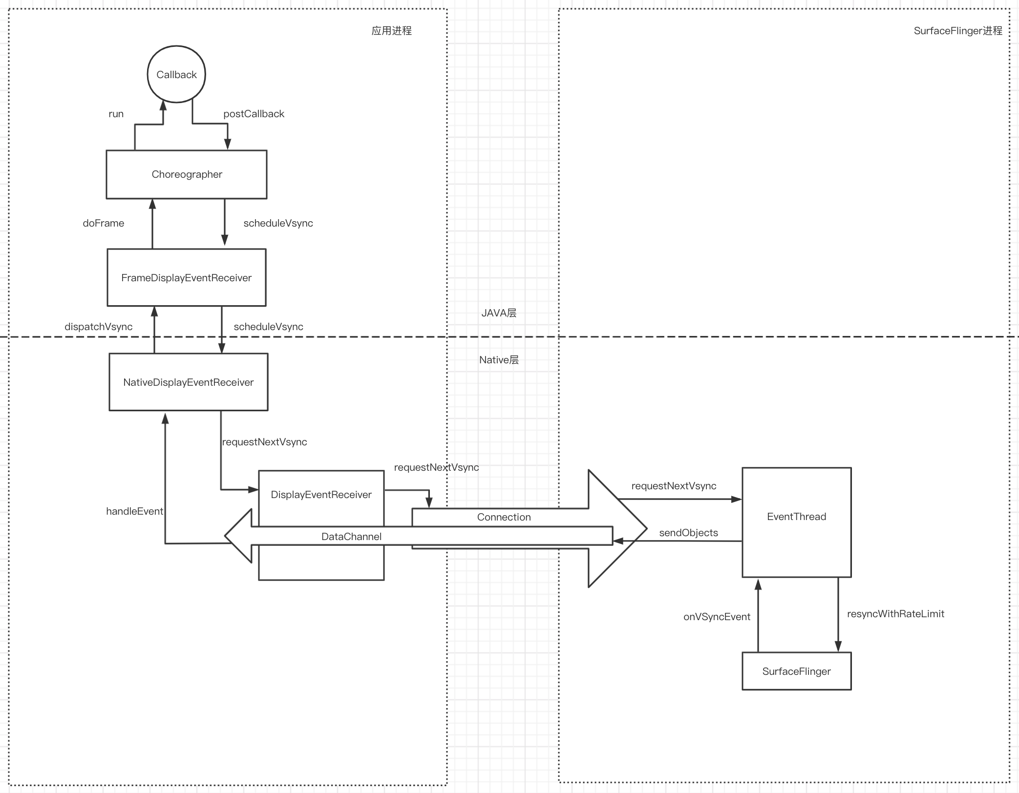 ViewRootImpl将Callback丢到Choreographer之后,通过FrameDisplayEventReceiver调到Native层的NativeDisplayEventReceiver。