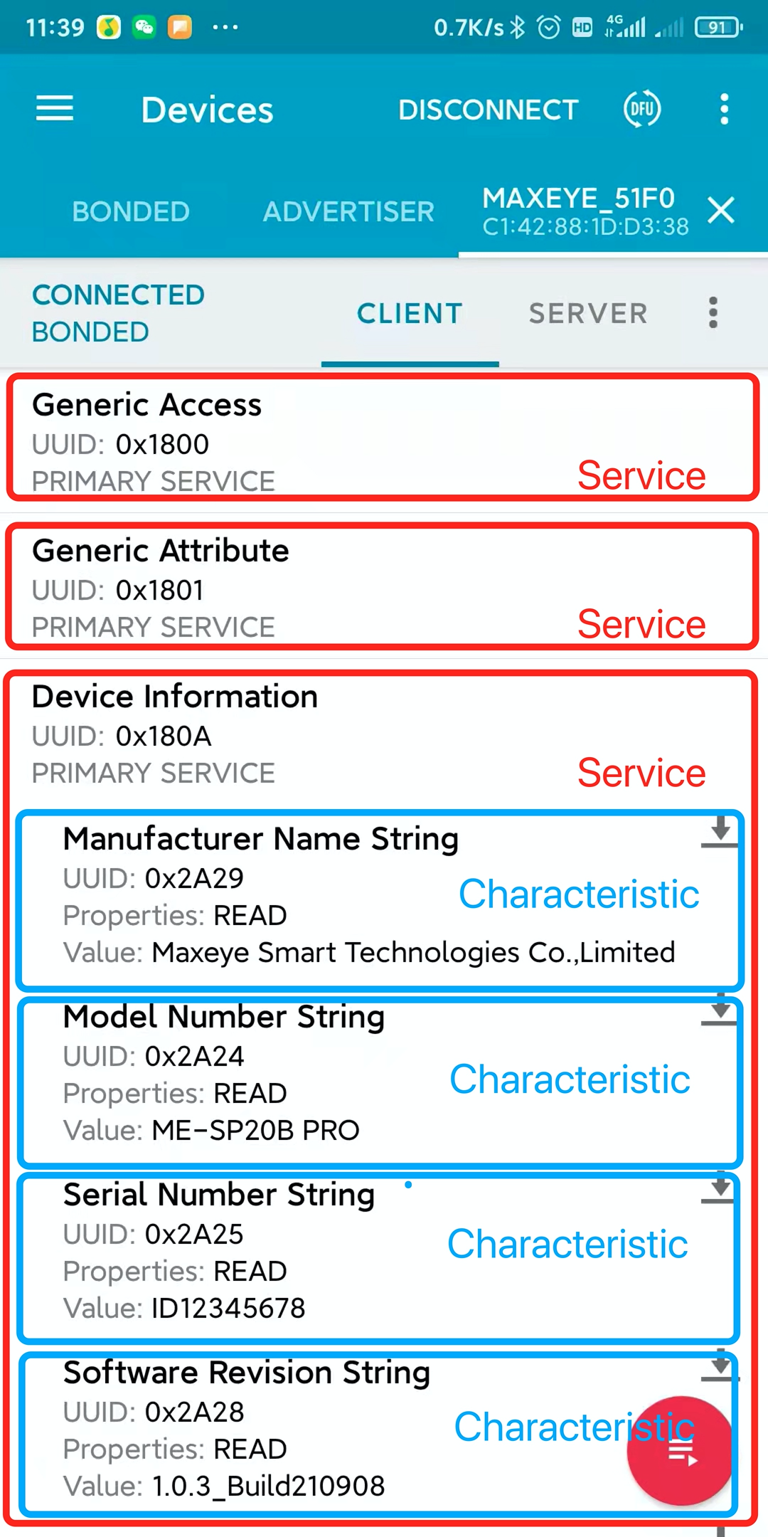 可以看到这里有Generic Access、Generic Attribute、Device Information三个Service。而Device Information Service下面又有四个Characteristic
