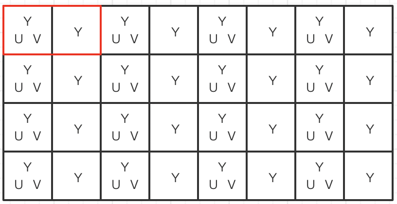 每四个像素共用一对UV分量,每像素平均占用Y + U + V = 8 + 2 + 2 = 12 bits