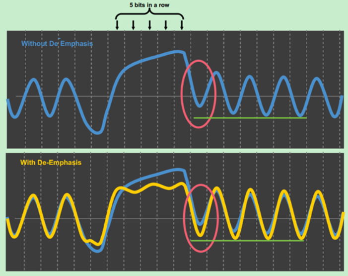 De-emphasis的具体做法是连续相同极性电平的第一个bit之后的bit,压低或者提高电压: