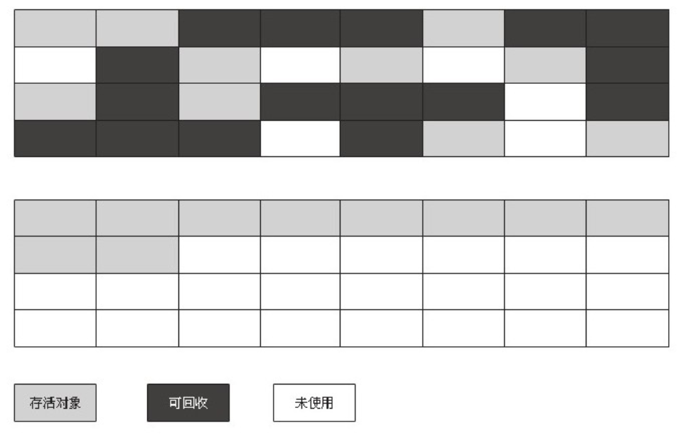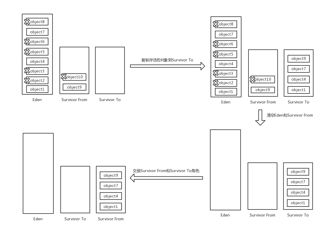 之后原来的Survivor From区就空了,而原来的Survivor To区就非空。这个时候它们的角色就调换了,空的叫做Survivor To区,非空的叫做Survivor From区。