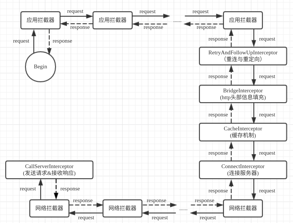 1 2 3 4 private Response getResponseWithInterceptorChain(boolean forWebSocket) throws IOException { Interceptor.Chain chain = new ApplicationInterceptorChain(0, originalRequest, forWebSocket); return chain.proceed(originalRequest); }