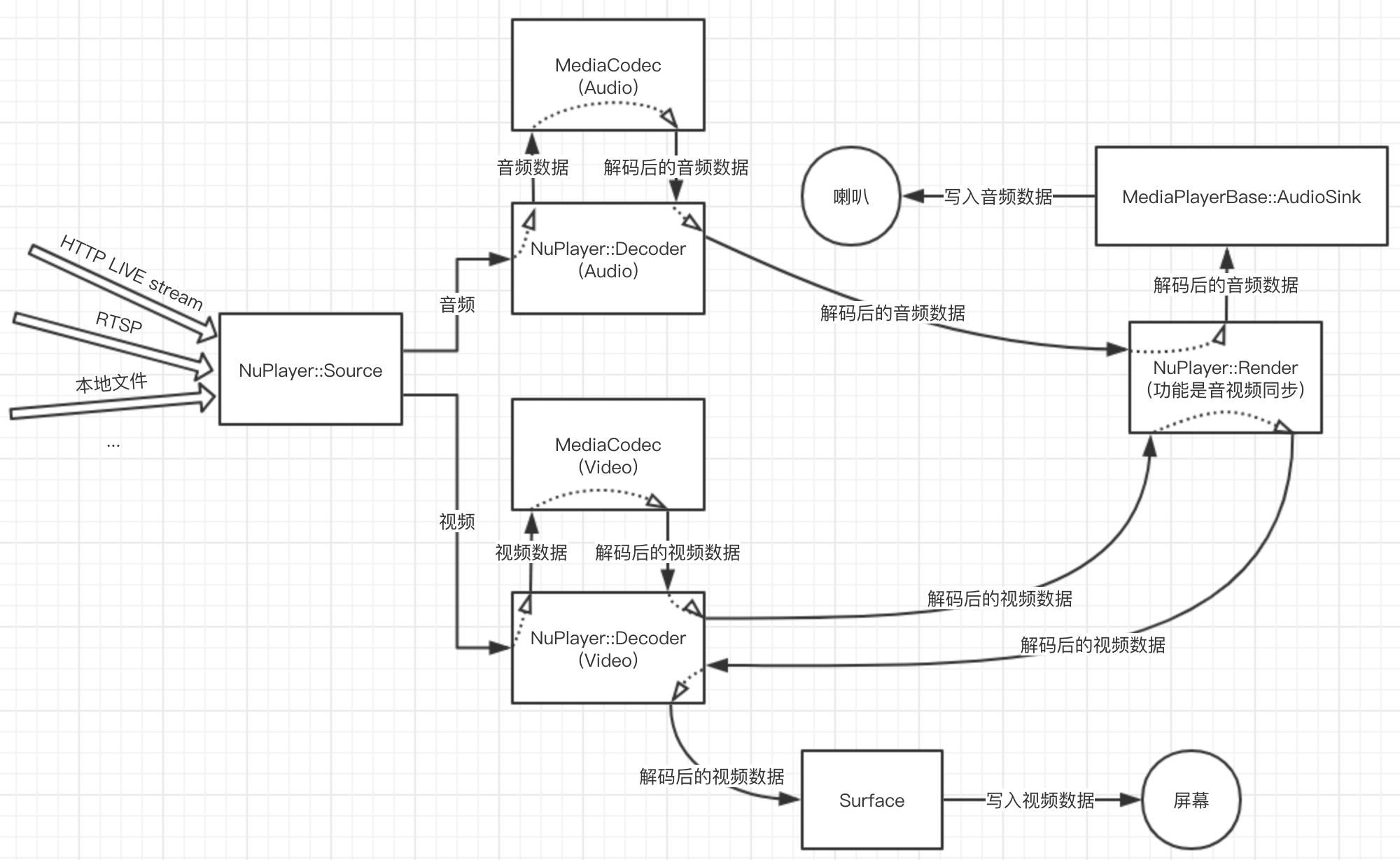 NuPlayer::Render顾名思义是做渲染的,但是经过代码分析,其实它的逻辑只是做音视频同步,然后音频渲染会交给MediaPlayerBase::AudioSink,而视频渲染会交回给NuPlayer::Decoder再交给MediaCodec。