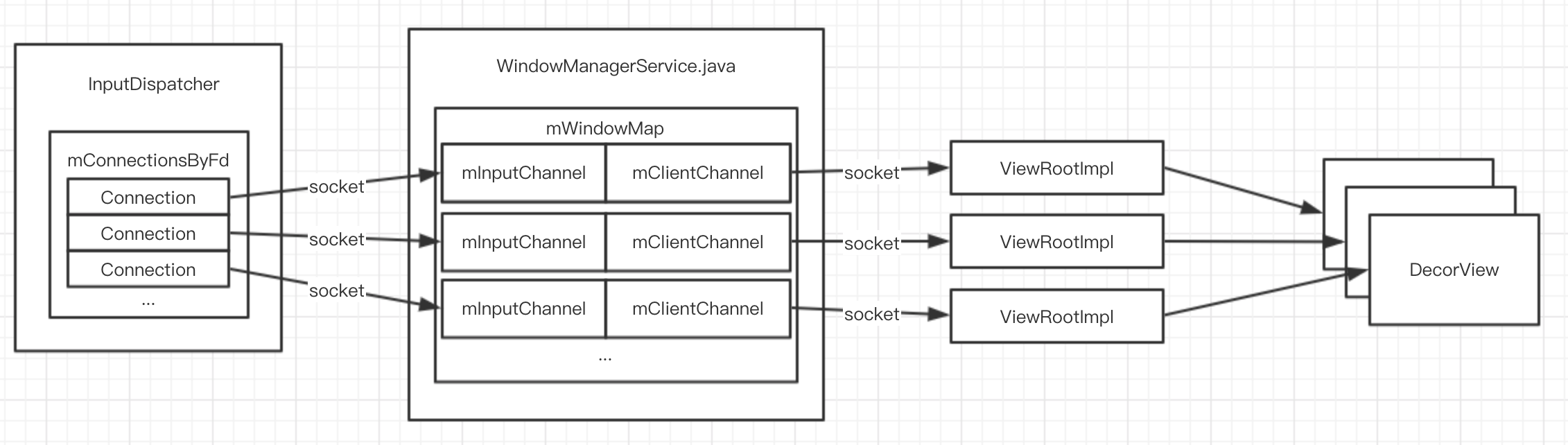 在应用层新的顶层窗口需要被注册到WMS中是在ViewRootImpl.setView实现的,我们从这里开始一路往下追,可以看到最后会调用到InputDispatcher::registerInputChannel注册通信的channel__放到InputDispatcher::mConnectionsByFd__这个KeyedVector里面: