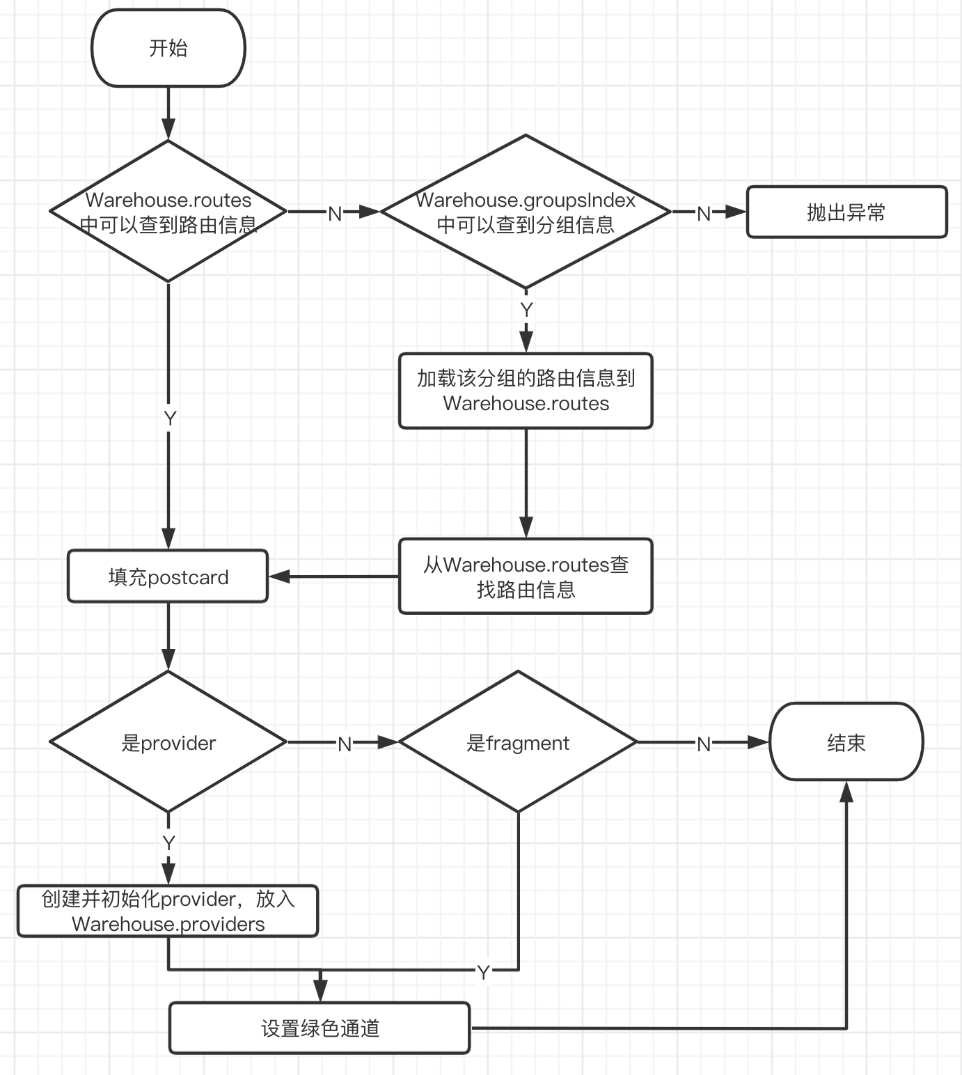 1 2 3 4 5 6 7 8 9 10 11 12 13 14 15 16 17 18 19 20 21 22 23 24 25 26 27 28 29 30 31 32 33 34 35 36 37 38 39 40 41 42 43 44 45 46 47 48 public synchronized static void completion (Postcard postcard) { ... RouteMeta routeMeta = Warehouse.routes.get(postcard.getPath()); if (null == routeMeta) { Class<? extends IRouteGroup > groupMeta = Warehouse.groupsIndex.get(postcard.getGroup()); if (null == groupMeta) { throw new NoRouteFoundException (TAG + "There is no route match the path [" + postcard.getPath() + "], in group [" + postcard.getGroup() + "]" ); } else { ... IRouteGroup iGroupInstance = groupMeta.getConstructor().newInstance(); iGroupInstance.loadInto(Warehouse.routes); Warehouse.groupsIndex.remove(postcard.getGroup()); ... completion(postcard); } } else { postcard.setDestination(routeMeta.getDestination()); postcard.setType(routeMeta.getType()); postcard.setPriority(routeMeta.getPriority()); postcard.setExtra(routeMeta.getExtra()); Uri rawUri = postcard.getUri(); if (null != rawUri) { ... } switch (routeMeta.getType()) { case PROVIDER: Class<? extends IProvider > providerMeta = (Class<? extends IProvider >) routeMeta.getDestination(); IProvider instance = Warehouse.providers.get(providerMeta); if (null == instance) { ... provider = providerMeta.getConstructor().newInstance(); provider.init(mContext); Warehouse.providers.put(providerMeta, provider); instance = provider; ... } postcard.setProvider(instance); postcard.greenChannel(); break ; case FRAGMENT: postcard.greenChannel(); default : break ; } } }