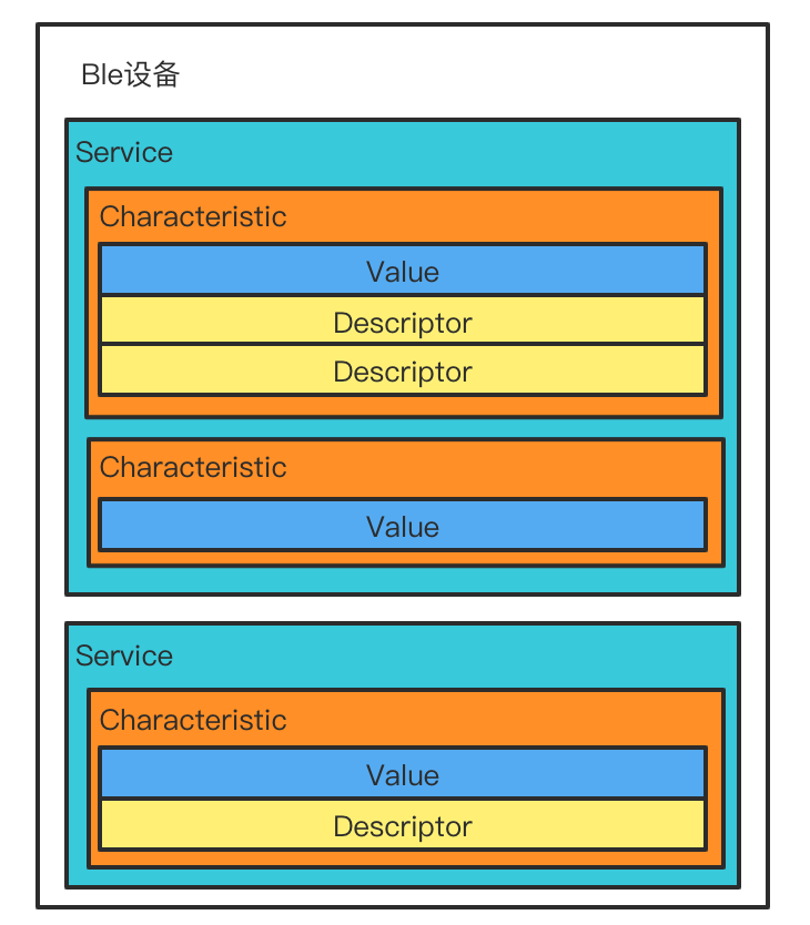 Ble设备里面会提供多个Service,这些Service会提供一些特定的功能。而每个Service里面有会有多个Characteristic,这些Characteristic里面的value实际就是功能具体的属性值。