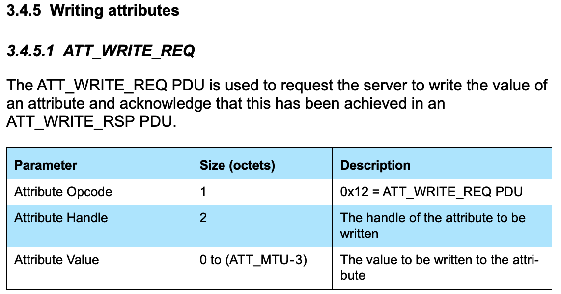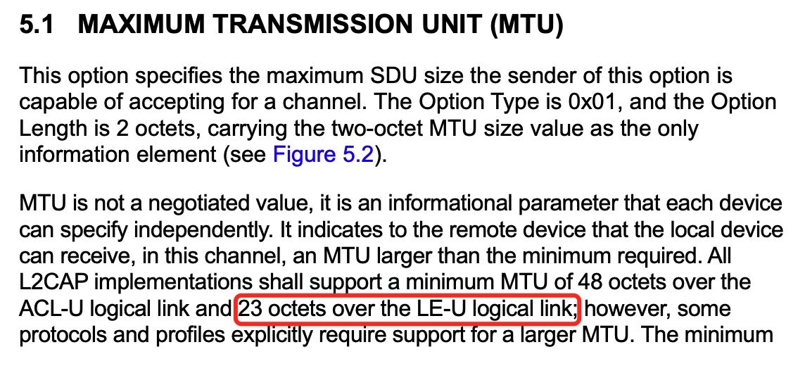 可以看到我圈出来的地方,MTU最小需要支持23个字节,但是实际上这23三个字节也不是全部用来放数据,它的头三个字节需要携带操作类型和属性的16位uuid。所以只剩下23-3=20个字节用于传输数据:
