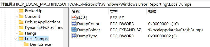 它也支持在HKEY_LOCAL_MACHINE\SOFTWARE\Microsoft\Windows\Windows Error Reporting\LocalDumps下添加子项,为指定的exe进行单独配置: